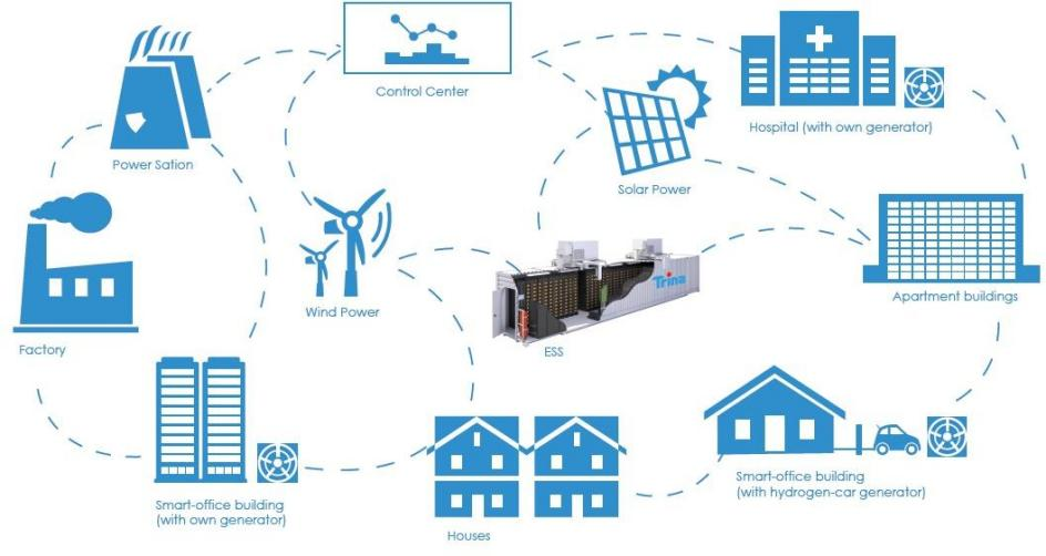 储能系统可同时运用在传统电力行业以及与新能源如风能,太阳能或者其他能源进行互补,在发电端, 输配电端以及终端用户端解决电网问题,有效平滑电网波动,提高电能质量,甚至通过峰谷电价差获 得经济利益。