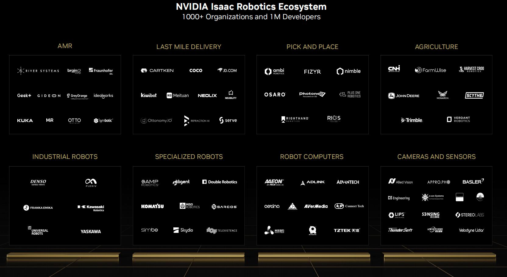 Isaac机器人平台也收获了从物流、制造到零售、能源、可持续农业等多个行业一众生态的支持,目前已有超过一百万开发者在使用NVIDIA Isaac机器人平台,超过一千家企业依赖于该平台的一个或多个部分。