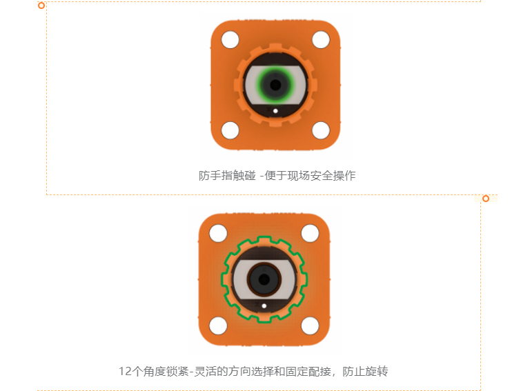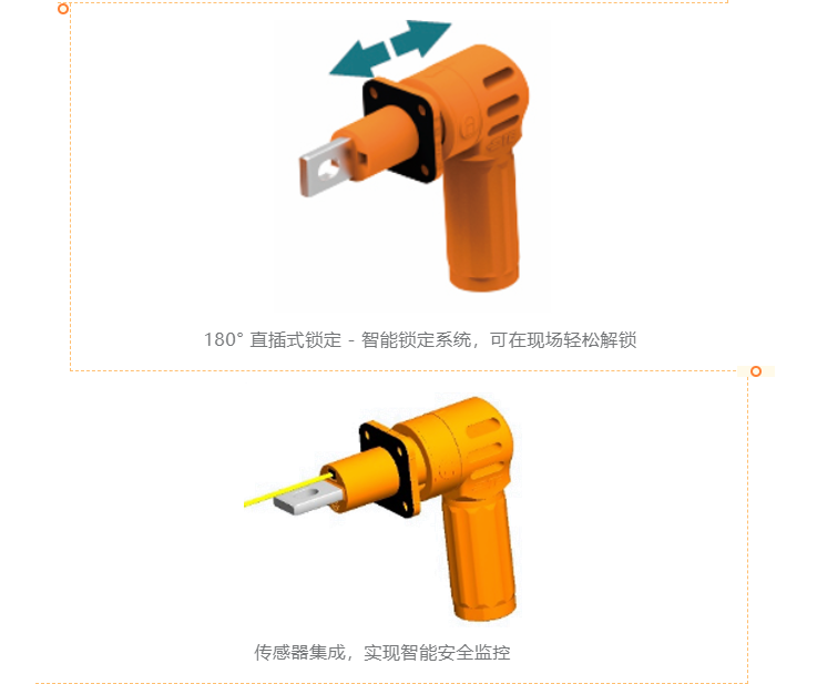 智能锁紧系统采用 180°直插式设计,提供360°旋转,可从 12 个角度锁紧(每个角度旋转 30°),实现了快速锁紧,按压释放,更加便于大批量连接器的现场组装。