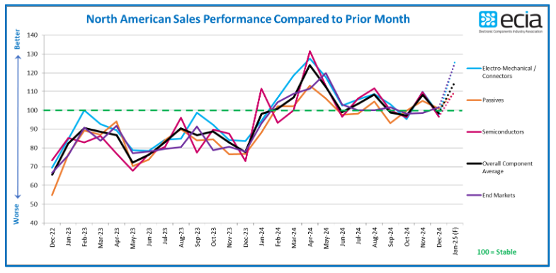 2024年12月ECST对供应链参与者的调查发现,与11月的展望相比,人们对12月销售的担忧有所缓和。11月的调查预测总体指数得分为94.4,这是自2023年12月以来的最低水平。12月调查的实际结果显示,人们的担忧有所缓和,实际得分为98.4,较11月大幅下降,但与前几个月持平。被动组件是12月份唯一一个得分超过100的类别,得分为101.0。令人鼓舞的消息来自2025年1月的展望,预测将跃升16.8点,总分为115.2。