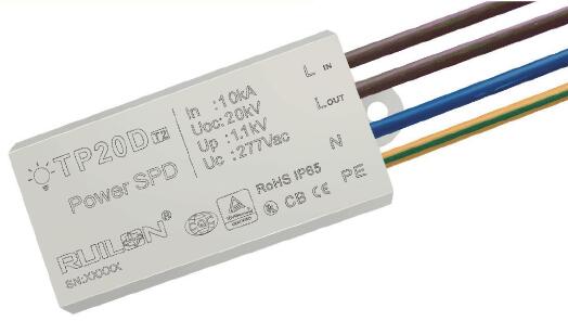 LED照明浪涌保护模块,它用于商业照明电源的浪涌保护,例如:街道照明(ClassI2、ClassII3)、景观照明和电源端口(如安全、电器和插座)的浪涌保护。具有防火、防水、防尘和IP65等级的全密封外壳。防雷装置采用全模式保护,采用UVT1技术,具有漏电4和续流5中断功能。该产品体积小,配有L、N和PE电缆,便于安装和应用。产品最大保护雷电电流为20kA6,可承受20kV7浪涌电压冲击。